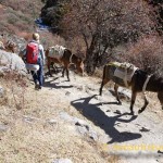 Endlich ging es los, am Fluss entlang, über Hängebrücken, durch Wälder immer das Tal hinauf! Es dauerte nicht lang, bis uns die ersten Wanderer entgegenkamen und wir von Esel-Karavanen und vollgepackten Portern überholt wurden. Unglaublich was die da alles den Berg hochschleppen! Baumaterialien, Essen, Gasflaschen etc. alles wird zusammengetüddelt mit einem Seil und mit einer art Stirnband getragen – dabei würden wir uns glatt das Genick brechen! Ein Porter schleppt an die 50 Kg und wiegt selber kaum mehr! Am interessantesten war aber eine kleine Omi, die förmlich dem Berg hochflog, natürlich mit schweren Korb beladen, und ganz nebenbei mit einer Spindel Faden drehte! Na wenn das nicht mal optimales Zeitmanagement ist ;)!